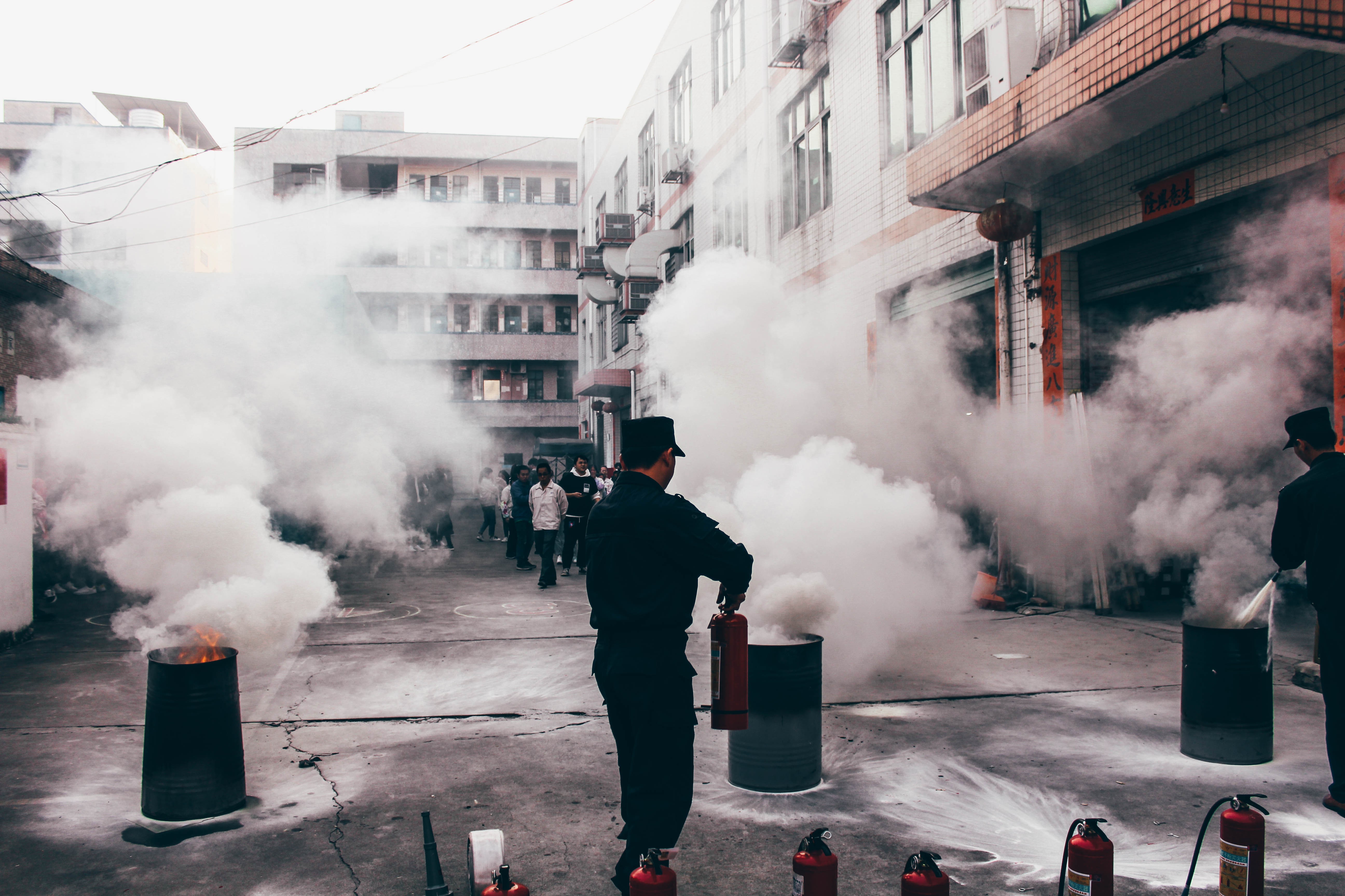 各部門(mén)人和員工,在使用泡沫滅火器實(shí)操。