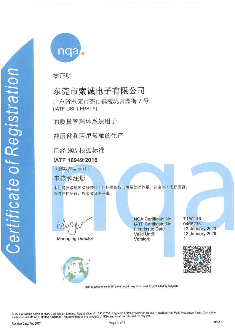 索誠電子不僅獲得了ISO9001質(zhì)量管理、ISO14001環(huán)境管理體系,還成功獲得了IATF16949汽車質(zhì)量體系!