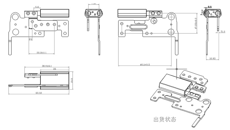 技術(shù)要求: 1.產(chǎn)品扭力要求:上下轉(zhuǎn)軸都為5.5±0.3kgf-cm 2.旋轉(zhuǎn)角度:上下轉(zhuǎn)軸0度自鎖,上下轉(zhuǎn)軸旋轉(zhuǎn)360度且同時(shí)轉(zhuǎn)動(dòng), 出貨角度為180度 3.產(chǎn)品壽命要求15000次(速度3次/分鐘),衰減率不大于20% 4.鋅合金外觀不能有刮傷,碰傷,缺料,烤漆脫落等不良現(xiàn)象 5.鋅合金需與轉(zhuǎn)軸固定牢固,不能松脫現(xiàn)象 6.所有加工工藝都需符合環(huán)保要求 7.帶 號(hào)尺寸為重點(diǎn)管制