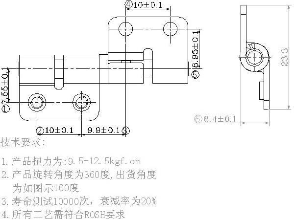 電腦合頁(yè)轉(zhuǎn)軸技術(shù)要求: 1.產(chǎn)品扭力為:9.5-12.5kgf.cm 2.產(chǎn)品旋轉(zhuǎn)角度為360度,出貨角度 為如圖示100度 3.壽命測(cè)試10000次,衰減率為20% 4.所有工藝需符合ROSH要求 |