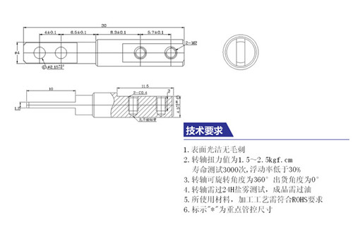 小一字轉(zhuǎn)軸技術(shù)要求: 1.表面光潔無毛刺 2.轉(zhuǎn)軸扭力值為1.5~2.5kgf.cm 3.轉(zhuǎn)軸可旋轉(zhuǎn)角度為360°出貨角度為0° 4.轉(zhuǎn)軸需過24H鹽霧測試,成品需過油 5.所使用材料,加工工藝需符合ROHS要求 6.標示“*”為管控尺寸 |